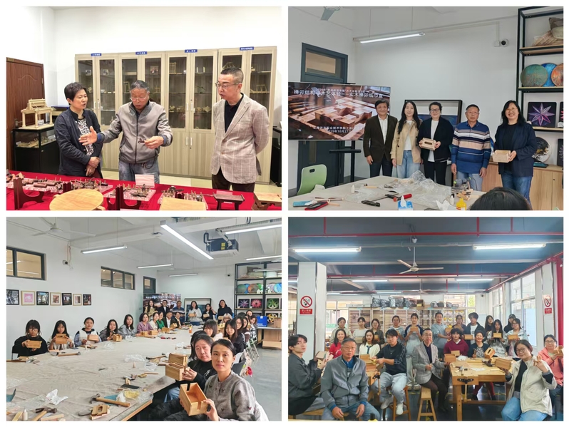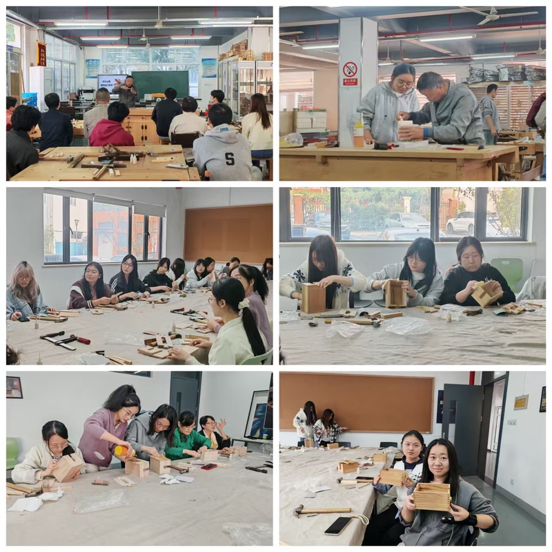 宣讲结束后,活动进入了最受期待的“木艺体验”环节。在顾老师的演示后,每一位参与的师生纷纷拿起工具,手持砂纸,从粗砂到细砂,顺着木纹细细打磨木料表面,原本略显粗糙的实木逐渐变得光滑温润。打磨完成后,开始认识榫头与卯眼,大家跟着顾老师的指导,小心翼翼地尝试拼装,将榫头对准卯眼,轻轻敲击使两者精准咬合,过程中既要把控力度避免木料受损,又要确保接口严丝合缝。“看似简单的拼接,其实特别考验耐心,稍微偏一点就装不进去。” 一位初次接触木艺的同学表示,当成功将底座与侧板通过榫卯连接起来时,成就感油然而生。现场叮咚的敲击声与阵阵赞叹声交织在一起,传统工艺的魅力在亲手实践中得以绽放。