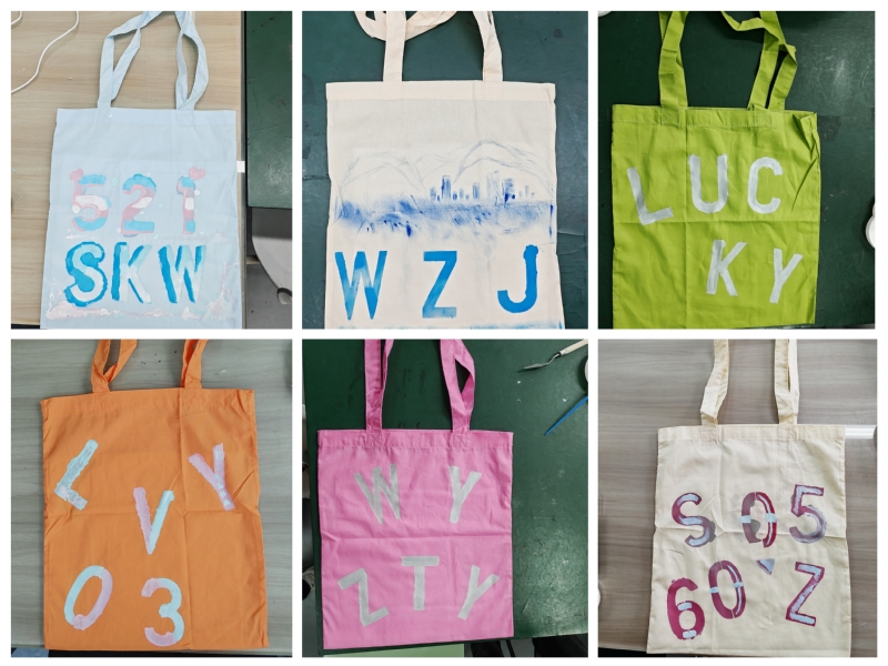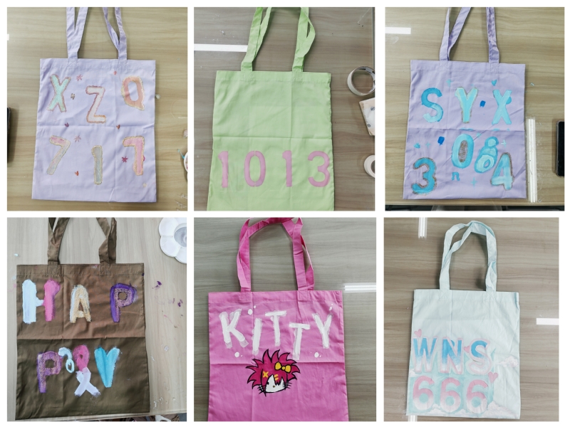 随后,师生们挑选自己喜欢的彩色包袋,运用模版、染料、塌包等工具,开启了创意之旅,活动过程中一名学生感慨:“亲手制作包袋的过程,让我体会到劳动的成就感,也更加珍惜传统文化的魅力。”在邓老师的指导下,通过印制、涂墨、塌印等步骤,一个个独一无二的作品诞生了,包袋上融合了现代字母和创意图案,寓意“劳动创造幸福劳动创造未来”。活动结束后,师生们纷纷表示收获颇丰,既深化了对劳动实践的热爱,更凝聚了对文化创新的认知。