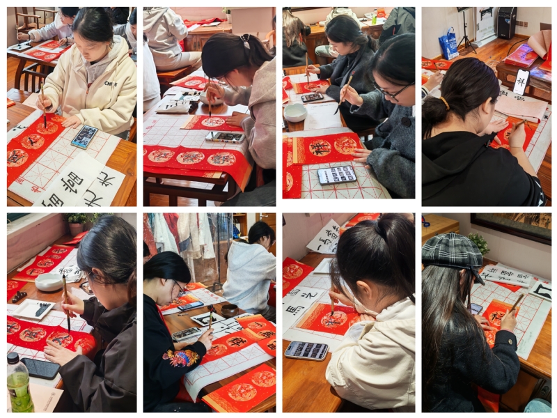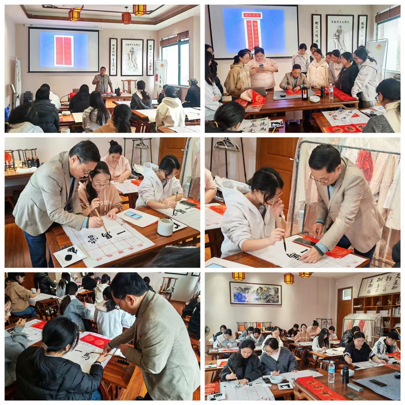 活动伊始,蒋荻老师从春联的起源、发展脉络讲起,细致解读了春联“字数相等、词性相对、平仄相拗、句法相同”的基本格律要求,让大家深刻认识到,一幅好春联不仅是笔墨的展现,更是文化内涵的传递。“写春联先懂春联,每一副春联都承载着人们对美好生活的向往,理解其寓意才能让笔墨更有温度。”蒋老师的话语让在场学生深受启发。