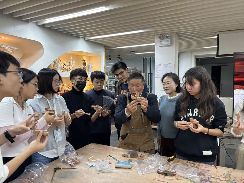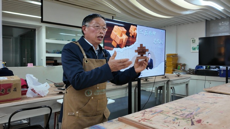 活动的第三环节是木艺体验——鲁班锁榫卯制作。顾惠明依据工作室原创的五步教学法展开教学。首先,顾老师亲自演示鲁班锁制作的全流程:从划线定位、榫卯锯割、木材打磨到结构拼装,最终呈现结构严密、工艺精湛的鲁班锁成品,每个工序皆需严谨耐心与细致专注。在顾惠明和郁勇勇的指导下,学生们亲手尝试制作鲁班锁,感受传统木艺的精妙与智慧。参与实践的学生一致反馈,通过动手劳动实践,既深切领略了传统工艺的精妙,亦对工匠精神形成了具象认知,现场氛围炽热活跃,充分彰显了非遗技艺传承的活力与魅力。