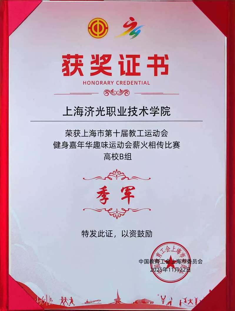 经过激烈角逐,我校获得高校B组 “薪火相传”比赛第三名,“合力跳长绳”“同心飞盘”、“使命必达”三个项目的第四名,总积分42分,团体总分第四的好成绩。