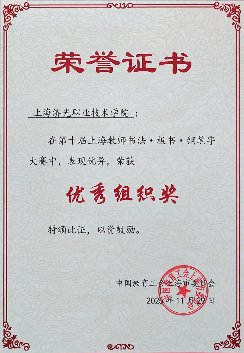 11月29日,由上海市教育工会主办的第十届上海教师书法·板书·钢笔字比赛在上海第二工业大学顺利举行。我校选派了张依群、陈希、贾须茹、刘倩、陈姿静五位教师参加比赛。老师们凭借扎实的书写功底和良好的综合素养,展现了济光教师队伍过硬的教学基本功和文化底蕴,我校荣获优秀组织奖称号。
