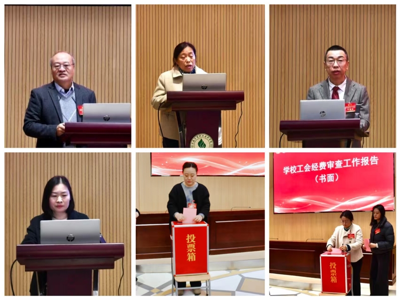 随后进行第一次全体会议,校长贺鹏飞作学校行政工作报告,系统地回顾了2025年的工作,重点部署了“十五五”开局之年的核心任务。财务处吴丹丹作学校财务情况报告;王云飞作学校工会工作报告及工会财务报告;发展规划处王娟汇报了学校“十五五”发展规划征求意见稿。会议还组织全体正式代表对学校领导班子及成员进行了民主评议,并书面审议了工会经费审查工作报告。