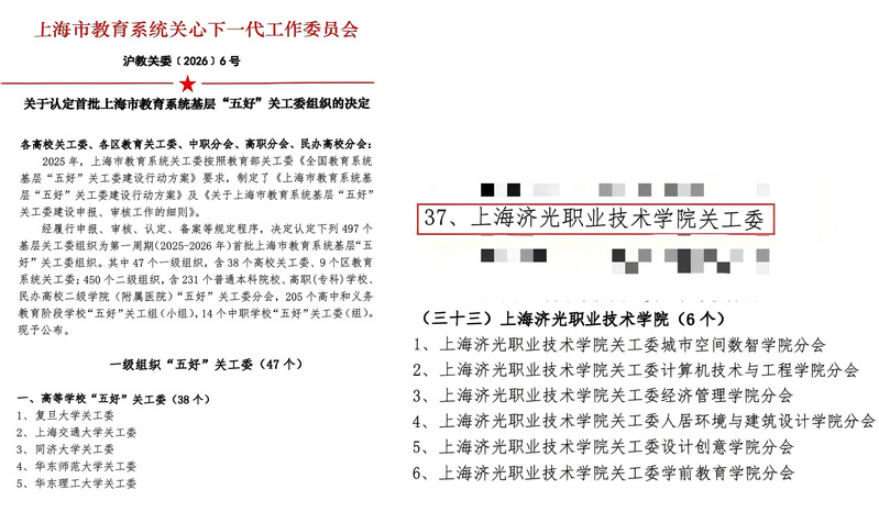 2026年3月23日,上海市教育系统关心下一代工作委员会印发《关于认定首批上海市教育系统基层“五好”关工委组织的决定》(沪教关委【2026】6号),公布首批基层“五好”关工委组织认定结果。上海济光职业技术学院关工委获批一级组织“五好”关工委,校关工委城市空间数智学院分会、计算机技术与工程学院分会、经济管理学院分会、人居环境与建筑设计学院分会、设计创意学院分会、学前教育学院分会荣获二级组织“五好”关工委。