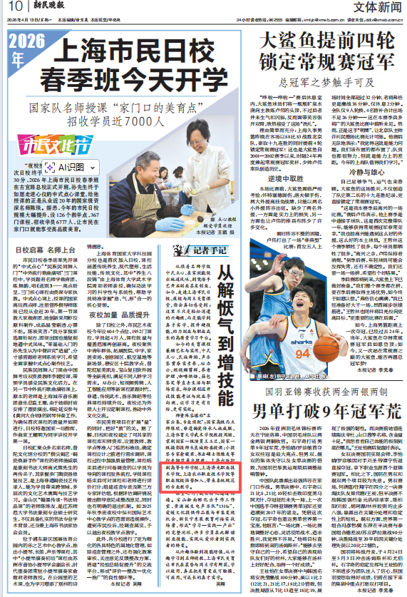 2026年4月13日,上海市民艺术夜校春季班正式开班。我校城市空间数智学院木工大师工作室作为新增课程正式加入市民夜校项目,推出《榫卯结构与木艺课程》特色项目,受到社会广泛关注。相关情况获《新民晚报》报道,彰显学校服务社会、传承中华优秀传统文化的责任担当。